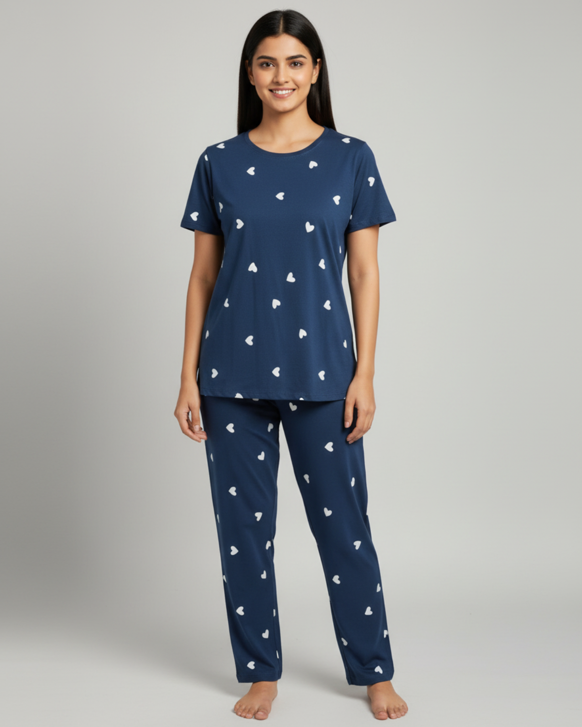 At PrettyOdd, we believe that fashion should be a reflection of your unique personality, and our curated collection of women’s Navy heart Co-Ord Set – is designed to help you express your individuality with flair. Whether you’re looking for the perfect casual tee for a laid-back weekend or a statement piece to elevate your everyday look, PrettyOdd has you covered. Tshirt & Pant set